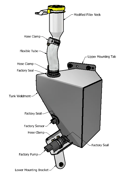 One of the many features of this kit is that it will require very little in the way of modifying your diesel Gladiator. You will reuse the fittings and wiring from your current reservoir tank, as well as using existing mounting locations, so that you will not have to drill into the frame. You will have to lengthen the filler assembly, and we provide the necessary hardware in order to make this modification.