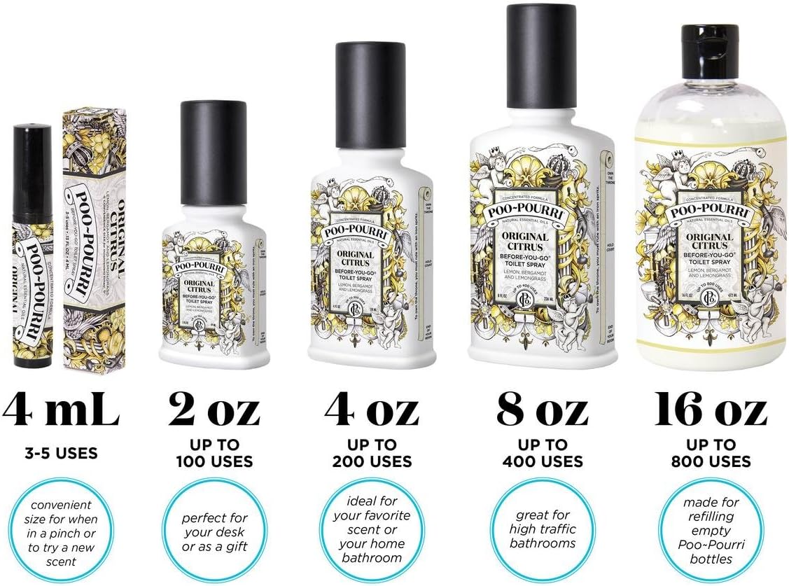 - How It Works: Shake well. Spritz 3-5 sprays into the toilet bowl on the water’s surface. Proceed to do your thing. Poo-Pourri traps bathroom odor under the water’s surface, so it never enters the air.